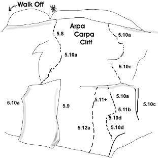 Approach is easiest from the top of the rock. You can climb a route up to the summit, or you can head right from the Weeping Wall then go left up a trail to the summit. When you reach the summit, head southwest, down a slope to the right of the cliff. At this bottom of the slope, Arpa Carpa Cliff will be found on your left. Your best bet is to buy the guide, it has much more detail on how to get to the right spot.