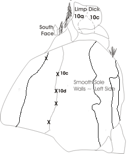 Two large walls with Chatsworth Chimney as the divider. Limp Dick sits at the top. On this Sole Wall face there are climbs for every skill of climber. Climbs up into the 5.11's and down into the 5.7's.